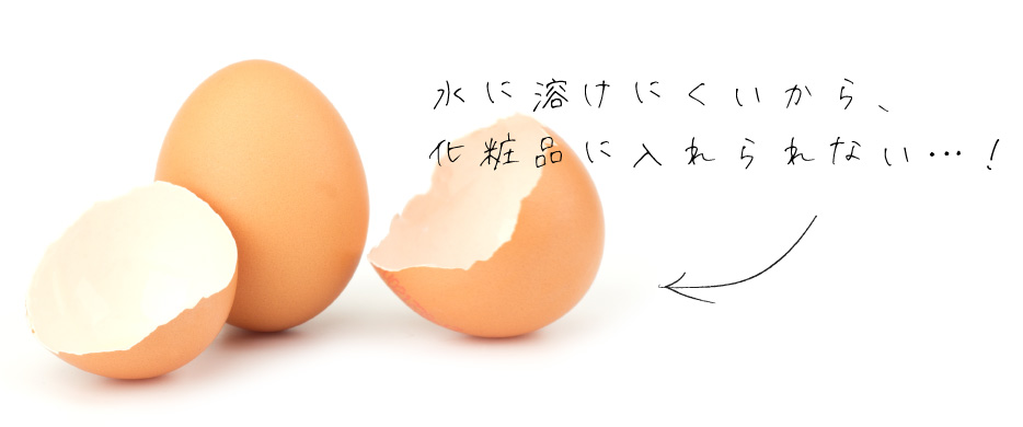 しかし、卵殻膜は今まで水に溶けにくい特性上化粧品に活かすことは難しいとされていました。