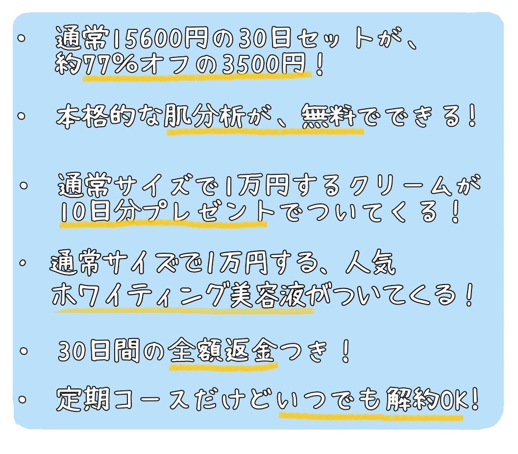 化粧水、美容液、クリームの3点セットがたっぷり1カ月試せるので、これくらいしてしまうのは仕方ないんです…。
