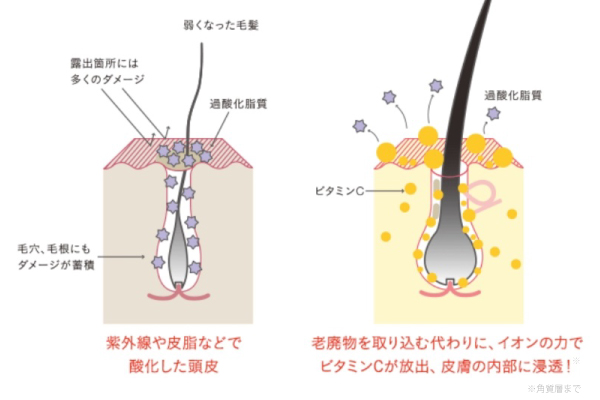 汗や老廃物を取り込む変わりに、イオンの力で新鮮なビタミンCが頭皮に放出され皮膚内部にドンドン浸透※していきます。