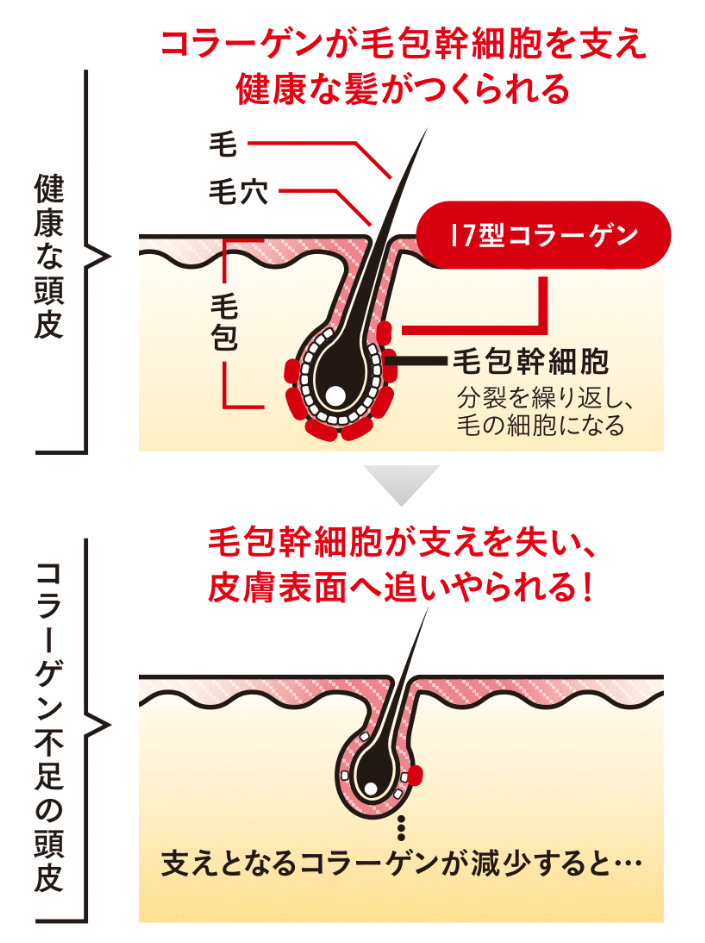 有名医大が発表した研究結果では、髪の元になる「毛包幹細胞」を保護する「17型コラーゲン」の減少が、薄毛の原因であることが判明したらしいです。