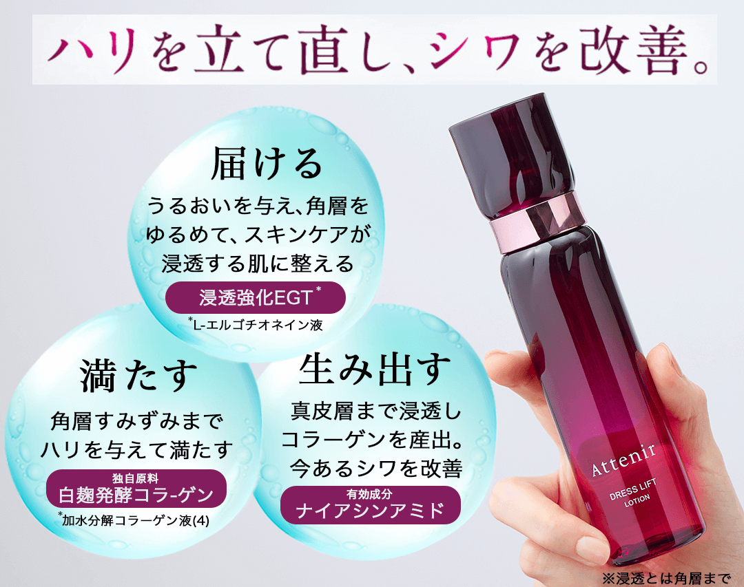 ドレスリフトはハリ・弾力を立て直し、シワを改善するための3つのアプローチ成分を配合!!