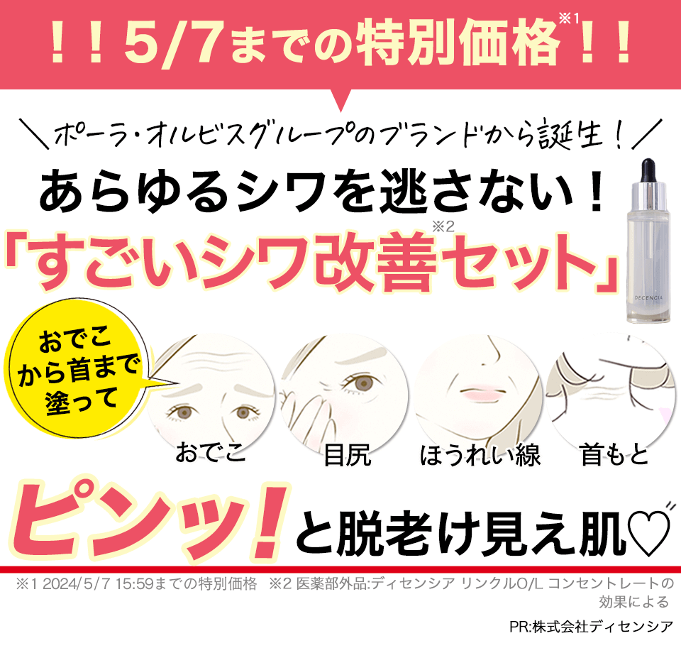 *2 医薬部外品:ディセンシア リンクルO/L コンセントレートの効果による *6 2024/5/7 15:59までの特別価格